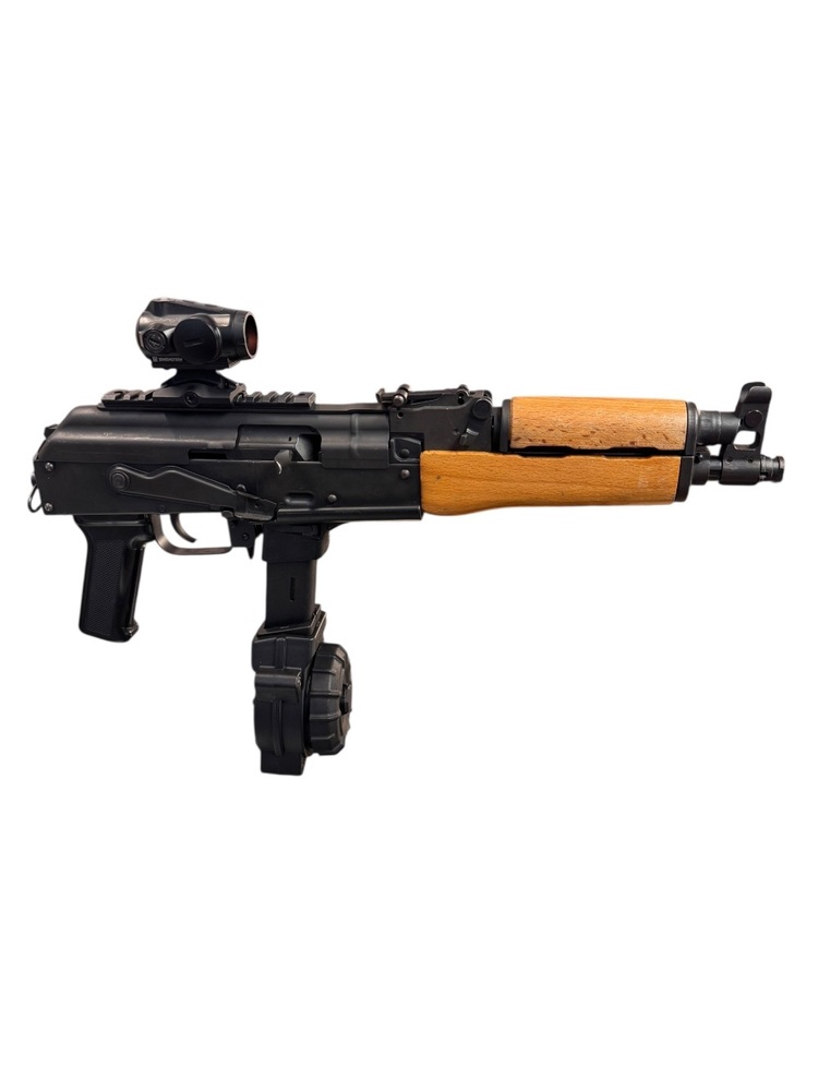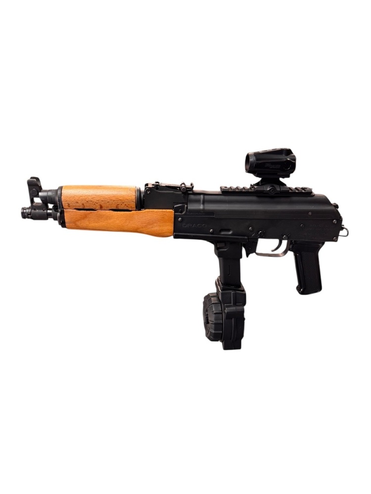 This Century Arms Draco is a reliable gun, chambered in the highly versatile 9mm caliber. Attachments include a drum magazine, increasing your ammunition capacity significantly. This particular model is in very good condition, showing minimal signs of wear and usage, ensuring performance isn't compromised. Draco is well-known for producing durable, functional handguns that provide robust performance at a reasonable price. This model blends utility, comfort, and shooting accuracy with robust construction to guarantee longevity. A compact design coupled with a high ammo capacity makes it an ideal choice for self-defense and casual shooting.