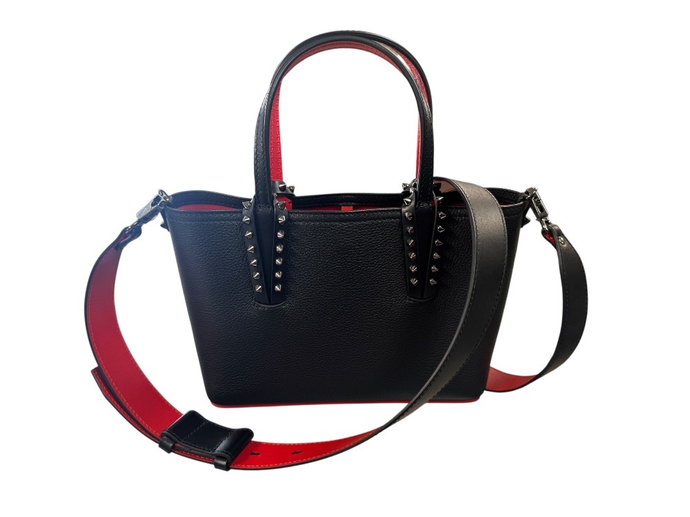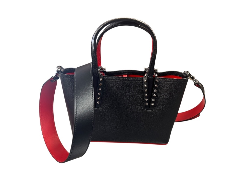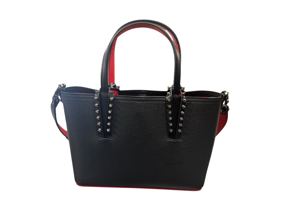 Behold the Christian Louboutin Cabata Mini Tote - the epitome of elegance wrapped in luxury. This mini wonder is a visual symphony; a seductive blend of grace and style, adorned with Louboutin's signature spikes. Its polished patina subtly reflects light, weaving an enchanting luminescence. The vivid red lining, a flamboyant confession of rebelliousness, unabashedly declares your love for all things chic. Handle it like a jewel, or swing it like a statement, this tote embodies versatility. Compact yet spacious, it cradles your essentials with a posh embrace. In this era of trending fashion, be the timeless classic with this Louboutin masterpiece!